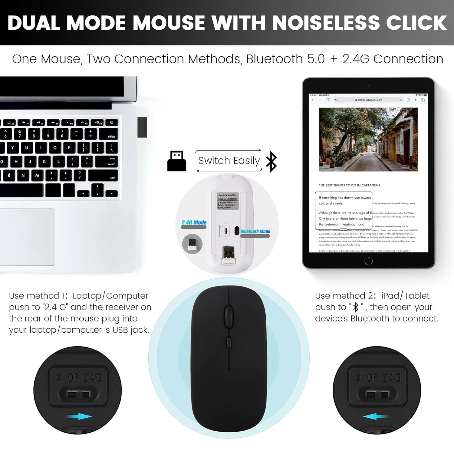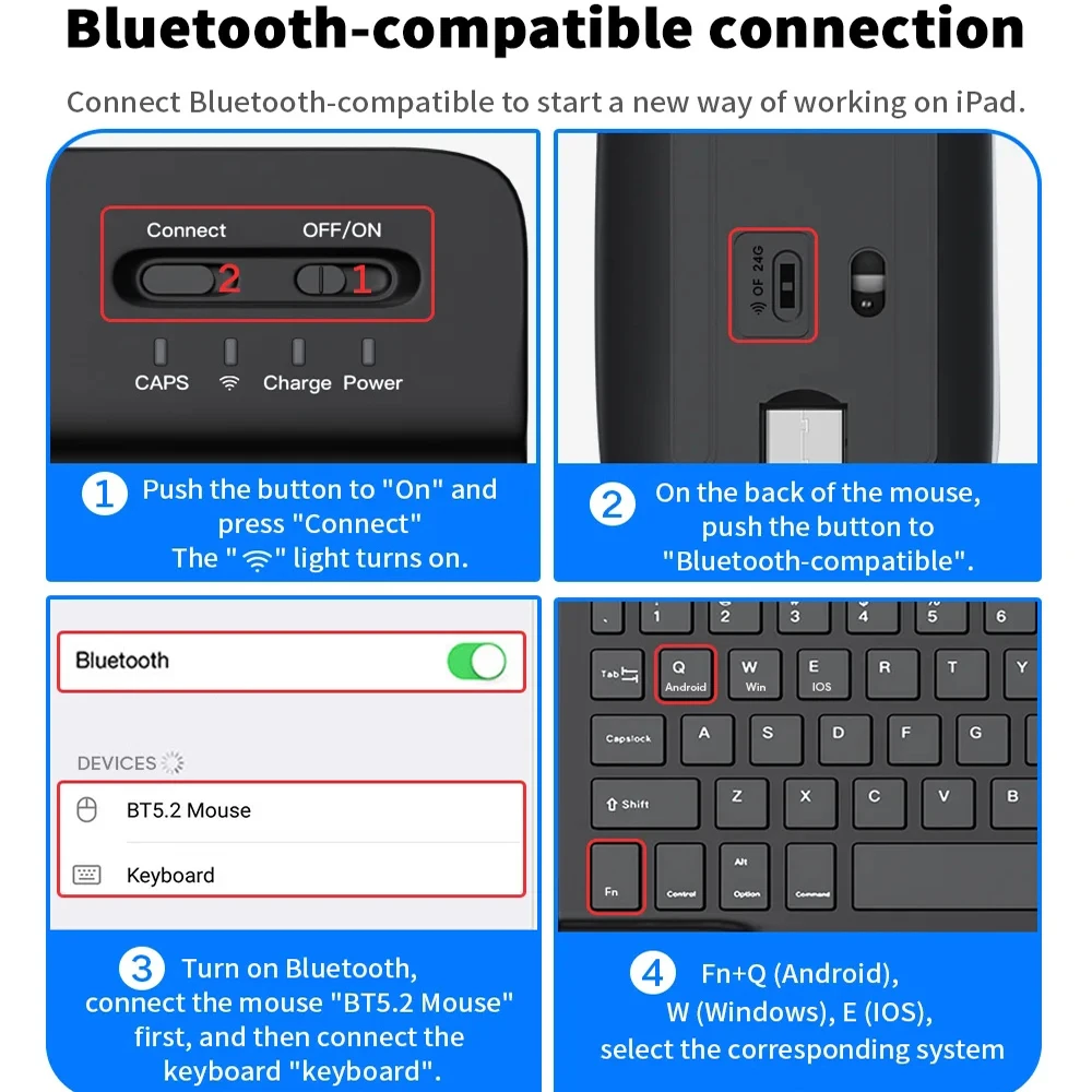 2. Mouse: Push the switch to the "Bluetooth" icon and find the Bluetooth connection with the "mouse" in the device Bluetooth list.
