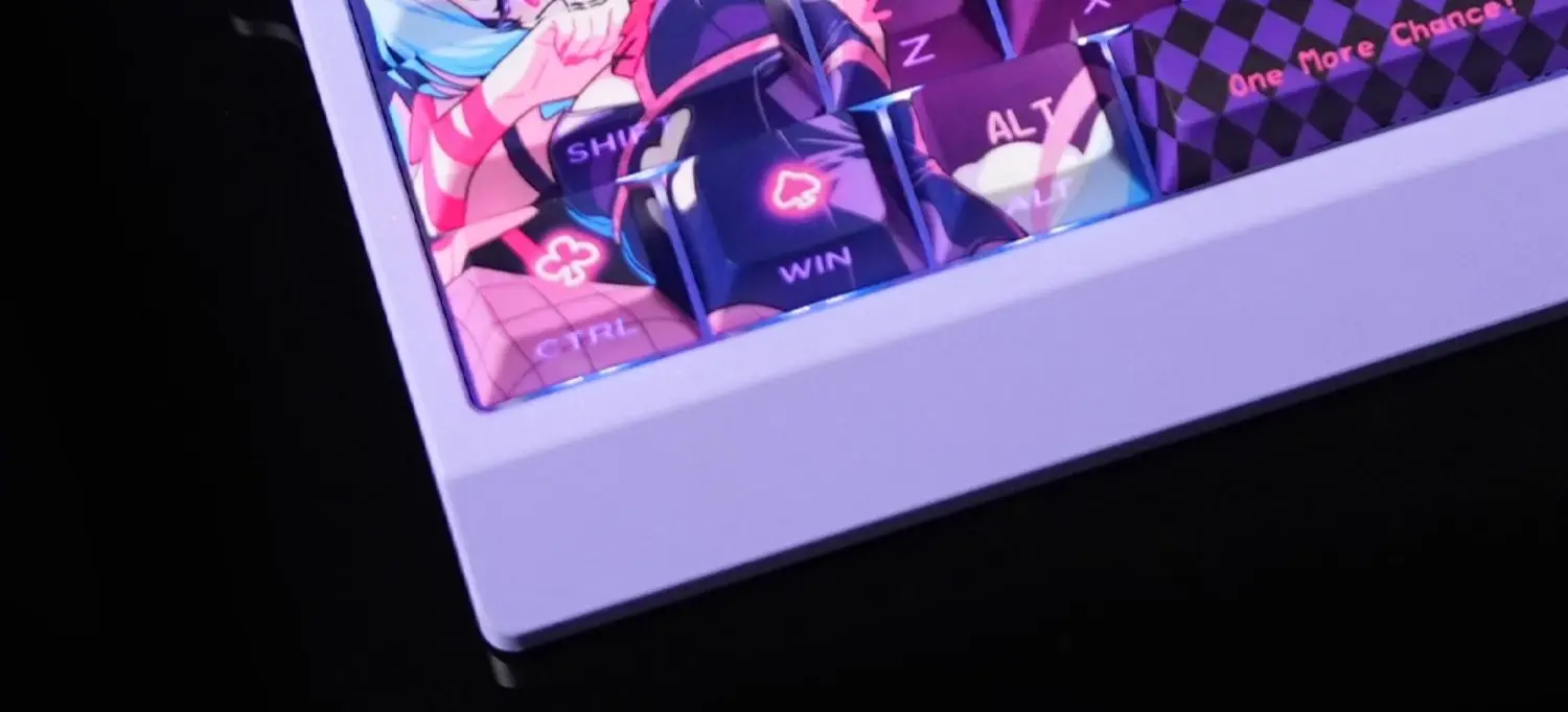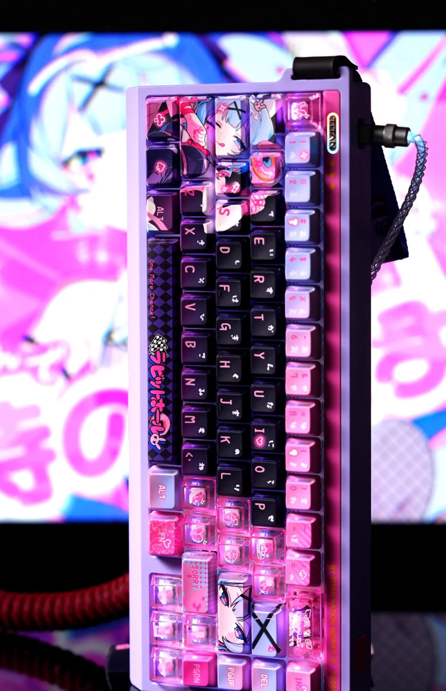 Un diseño vibrante en tonos rosa, morado y negro, con ilustraciones detalladas estilo anime que transforman completamente tu teclado.