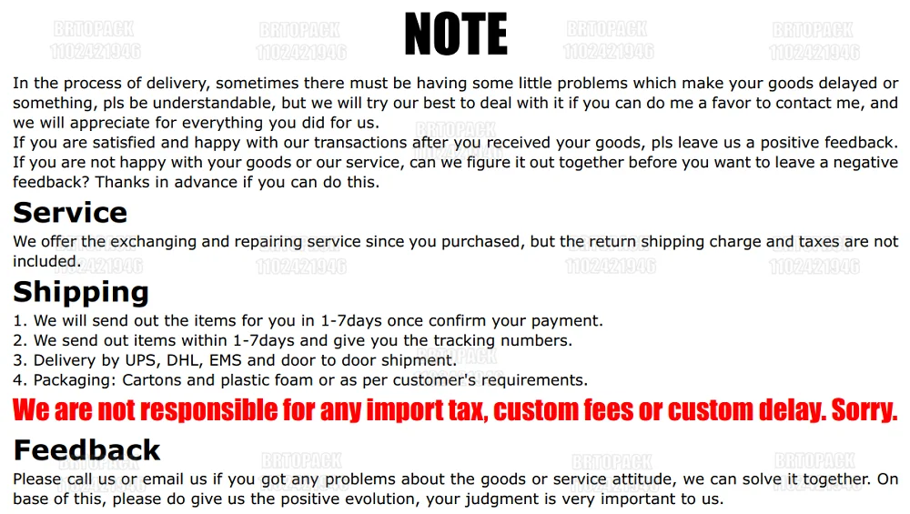 We are not responsible for any custom duty or import tax, it is buyer's responsibility.