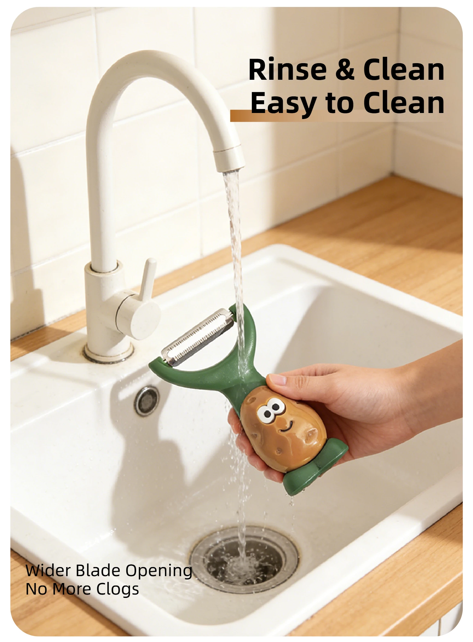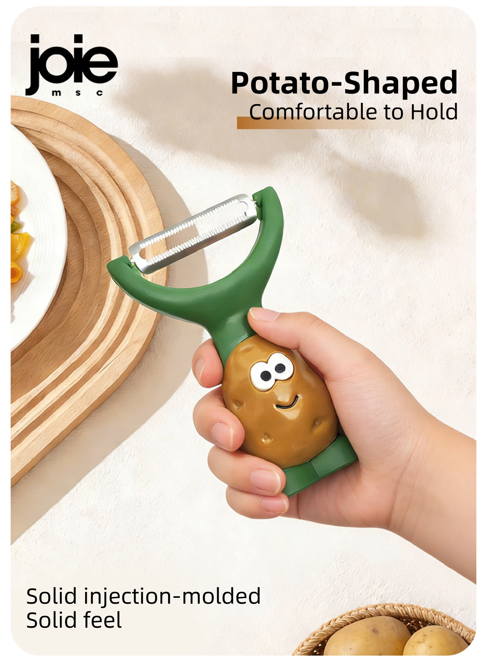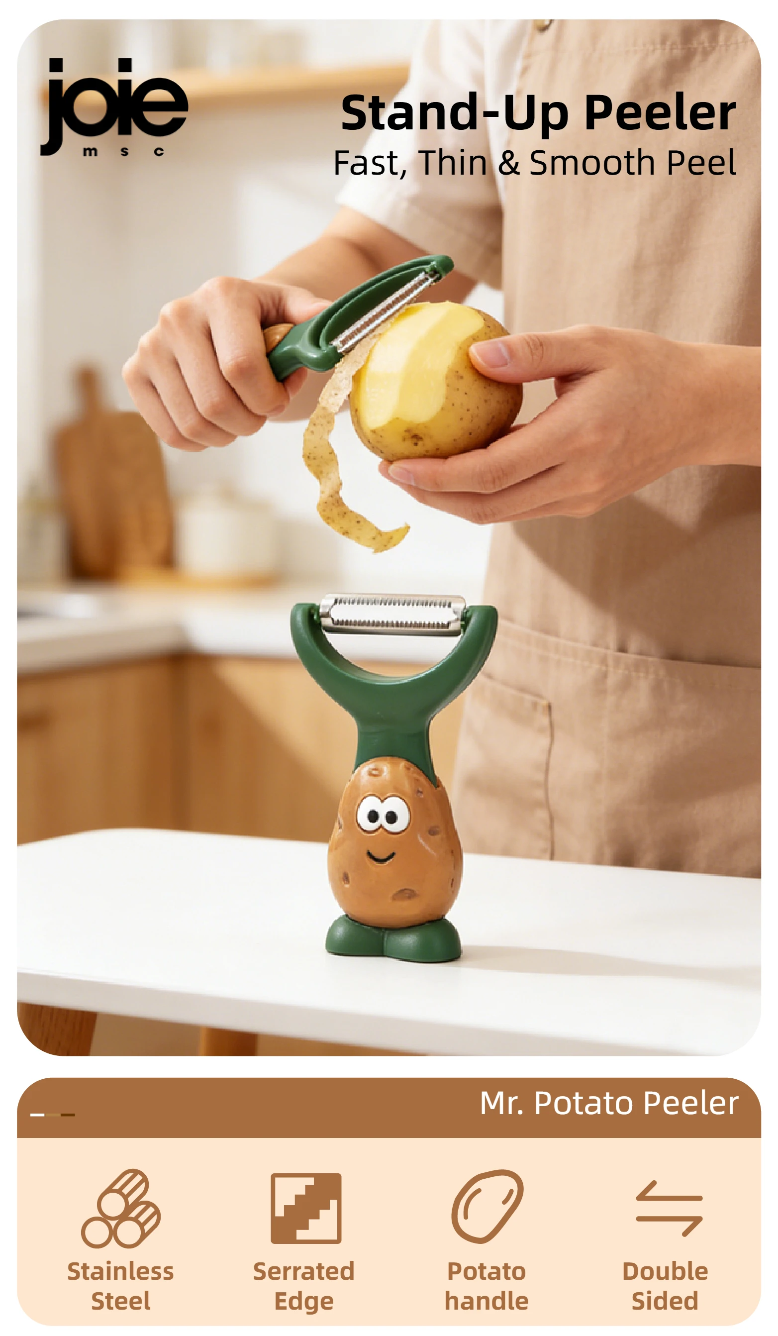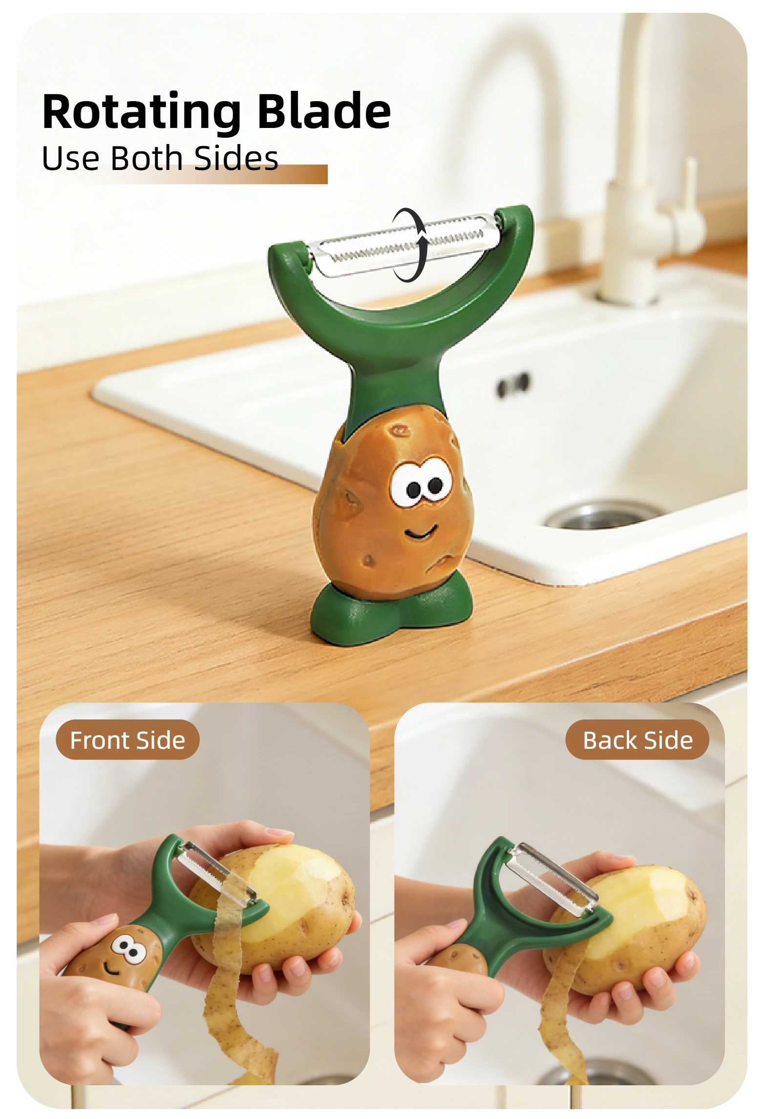 Descubre el pelador que revolucionará tu cocina. Con un diseño innovador que se mantiene de pie sobre la superficie, este Pelador Stand-Up combina funcionalidad, comodidad y un toque adorable que encantará a toda la familia.