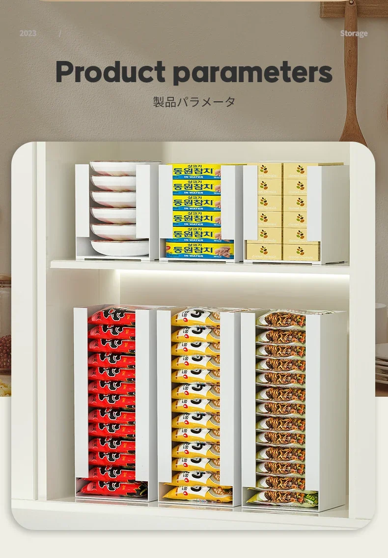 Su estructura vertical permite almacenar múltiples paquetes de ramen, sopas instantáneas o snacks de forma organizada y accesible.